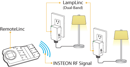 RemoteLinc sends RF commands (On, Off, Dim, Bright) to the LampLinc dual-band